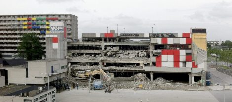 We hebben over de sloop subcentrum Kraaiennest al vele foto’s gepubliceerd. Toch willen we u deze van de Franse fotograaf Hubert Hervé niet onthouden. Hij verzon er ook een toepasselijke omschrijving bij: concrete slaughter.