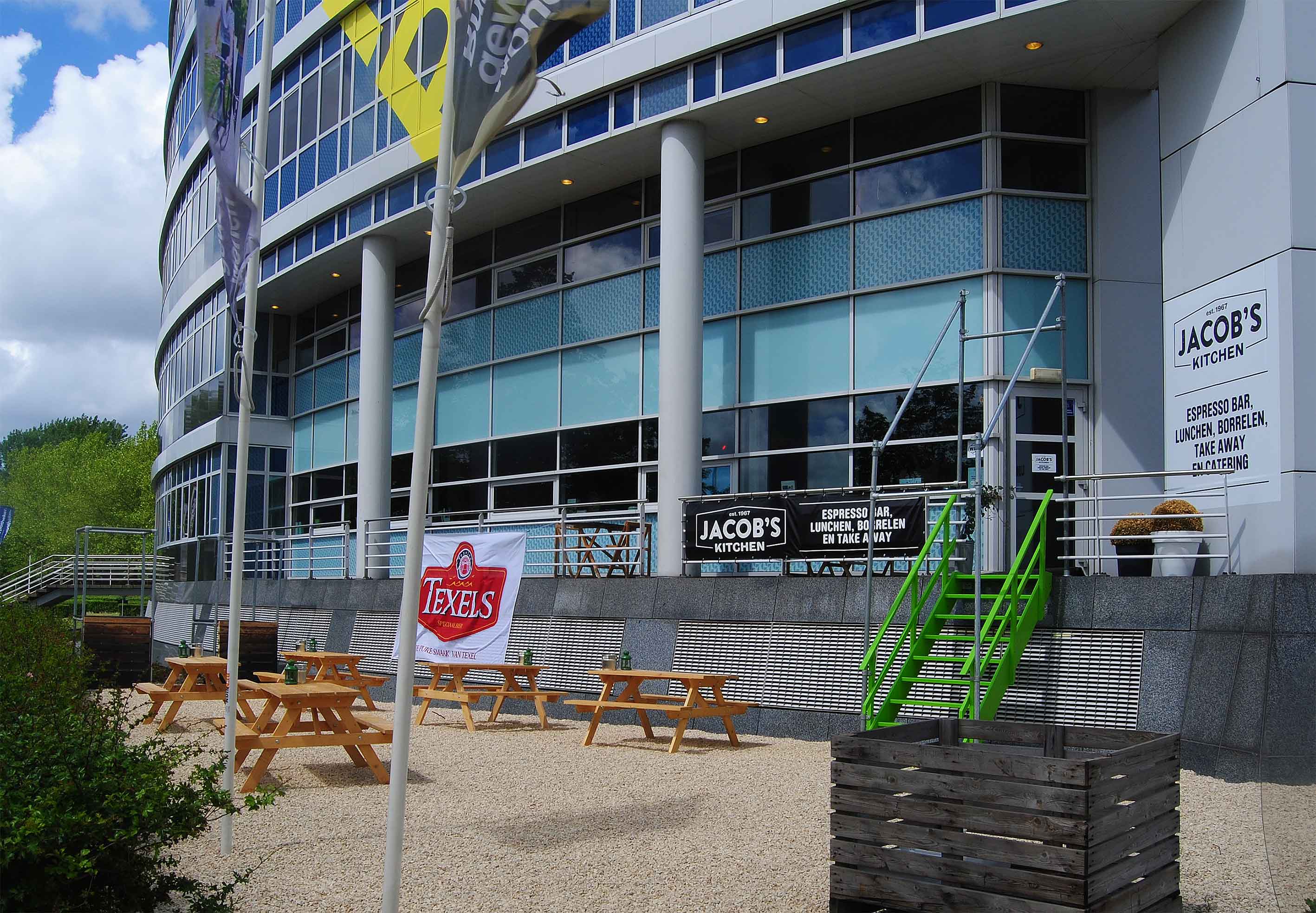 Een ander bouwproject dat niet opschiet, ligt bij onze noorderburen, in de kom van de Daalwijkdreef, de Bergwijkdreef en de metrobaan van Gaasperplas naar Centraal Station. Holland Park heet het project, een naam die ook een echt (en fantastisch) park siert in Chelsea London. Voor 5000 bewoners wordt daar een soort kopie gebouwd van Java-eiland, dat weer een kopie is een van de Amsterdamse binnenstad. Dus: grachtenpanden en appartementenblokken aan grachten, met binnentuinen en velerlei speciaalzaken, in een geïsoleerde enclave. Deze zomer hoopte men te beginnen met de bouw van het eerste blok, maar van enige bouwactiviteit is nog niets te bespeuren, en ook de sloop van alle kantoorgebouwen, die voor Holland Park moeten wijken, ligt stil. In het voormalige personeelsrestaurant van Xs4all, inmiddels allang verhuisd, is alvast een horecagelegenheid ingericht. Jacobs Kitchen heet het. Het heeft texels bier en een terras, maar een sloopgebied kent geen bewoners en bezoekers, hoewel her en der nog op een kantoor wordt gewerkt.