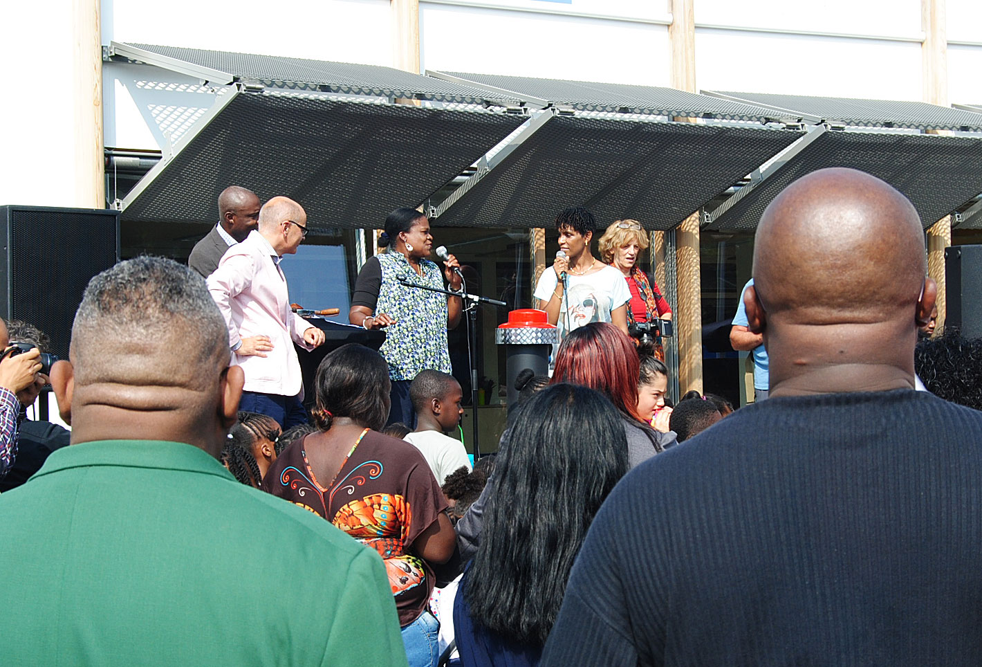 Foto is van opening gerenoveerd buurtcentrum Holendrecht, met de drie DB-ers op het podium, die ook alledrie hun zegje mochten doen, vlnr: Jaensch, Vyent en Dalgliesh.