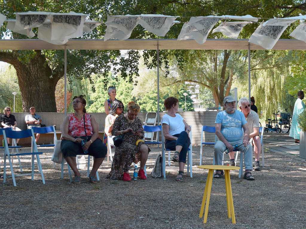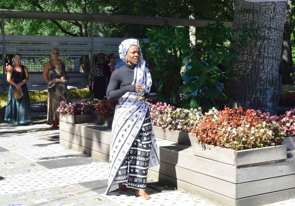 De ramp werd in ieder geval ons visitekaartje, geen Bijlmer rondleiding zonder een bezoek aan het monument. En zo kon het gebeuren dat afgelopen zaterdag 13 (!) augustus de ramp opnieuw omarmd werd onder leiding van een Ghanese kunstenares: Fatric Bewong een artist in residence, uitgenodigd door het CBK. Zo’n 30 mensen hadden zich aangemeld om met houtskool, zwart of rood, een afdruk te maken van de bast der bomen, die er altijd al waren en het ramp monument omringen, want zo schreef Fatric: We Are The Eyes That Saw, We Speak Of The Pain That Was, We Become The Hearts That Heal. De doeken met afdruk worden aan elkaar genaaid om op 4 oktober a.s. (en bij andere gelegenheden) als herinnering te dienen aan de voorbije 30 jaar. En de herdenking zal straks opnieuw worden georganiseerd door de stichting Beheer Het Groeiend Monument, al die jaren vanaf de start in 1999 in vertrouwde handen van Helen Burleson-Esajas (dan 82 jaar oud) en haar mede Surinaamse mensen, oudere vrouwen met name van de Evangelische Broeder Gemeente. En ongetwijfeld zal ook het geijkte orkestje weer akte de présence geven.