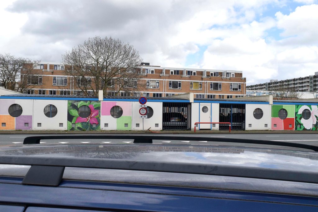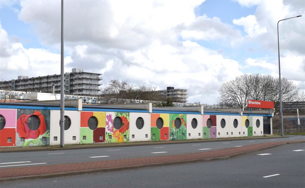Voor elk land zijn eigen karakteristieke bloem was het idee, maar zover kwamen ze natuurlijk niet, te weinig wandjes. En helaas is de Foppingadreef, waaraan Hoptille en Haarstee liggen, ook nogal saai en verlaten. De dreef verbindt op 3 meter hoogte de Karspel- en Hoogoorddreef. Ze heeft dus aan een kant garagewanden, waarvan de helft beschilderd is, en daar tegenover ligt het oude hoofdkantoor van ABN-Amro er geheel verlaten bij.
