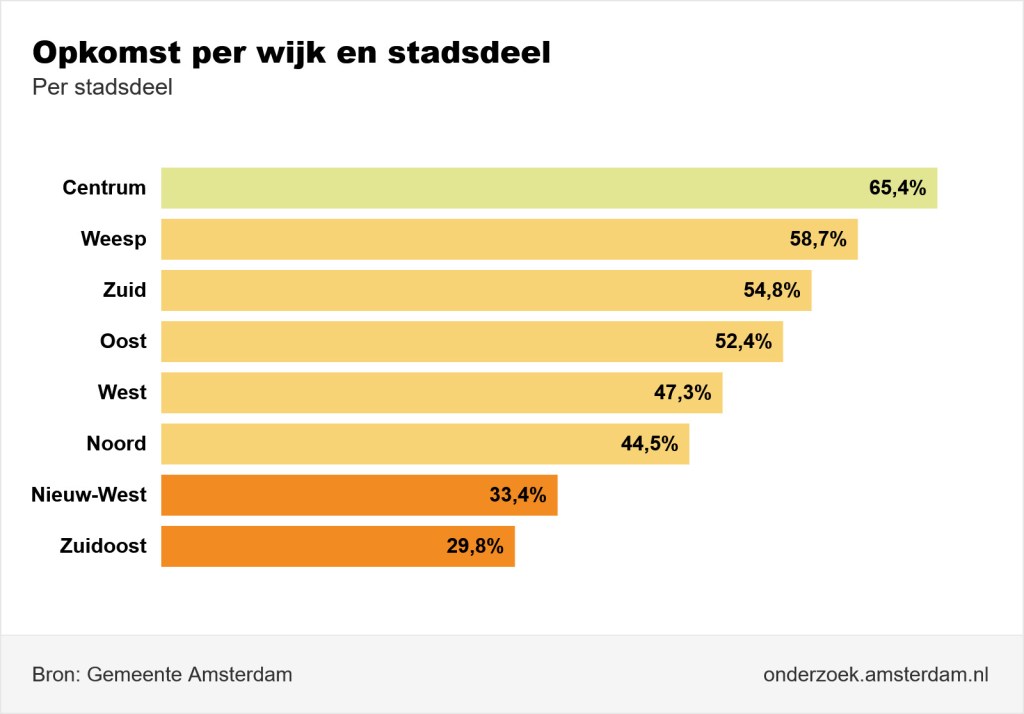 In zes van de acht stadsdelen scoorden Groen Links, de PvdA en D66 de meeste stemmen, behalve in Zuid – VVD 4 zetels, D66 3 en Groen Links 3 – en in Zuidoost koos 36% van de stemmen voor Groen Links en PvdA ( 4 zetels ), 14,5 % voor Bij1 ( 2 zetels ) en 8,9% voor D66 ( 1 zetel ). Groen Links en PvdA, die in komende tijd samen een nieuwe partij gaan vormen, krijgen dus als vanouds de macht.